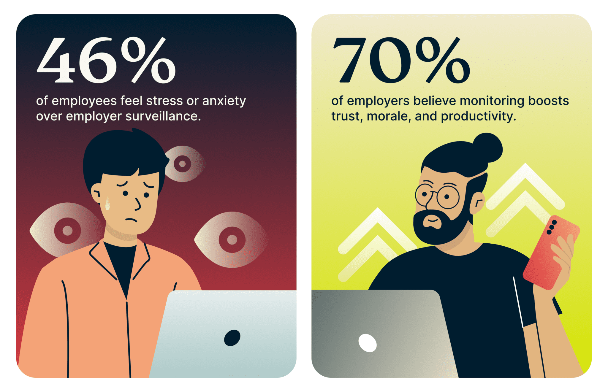 For their part, employers often see things differently. 70% claim monitoring boosts trust, morale, and productivity within their teams. But this narrative clashes with the lived experiences of many employees, who feel overwhelmed, pressured, and dehumanized by constant oversight.