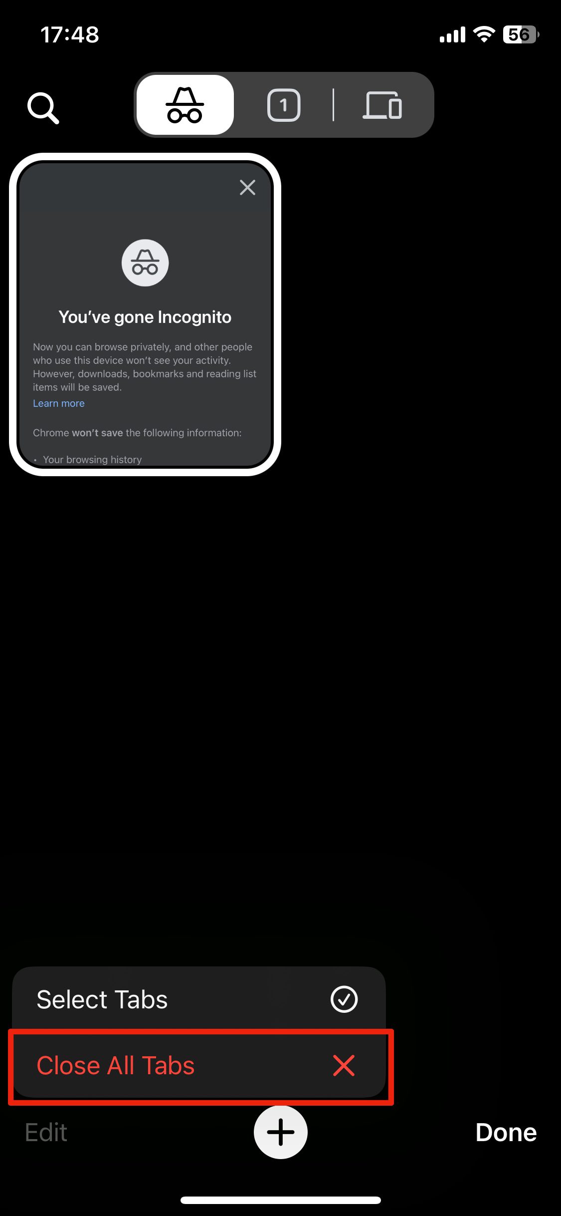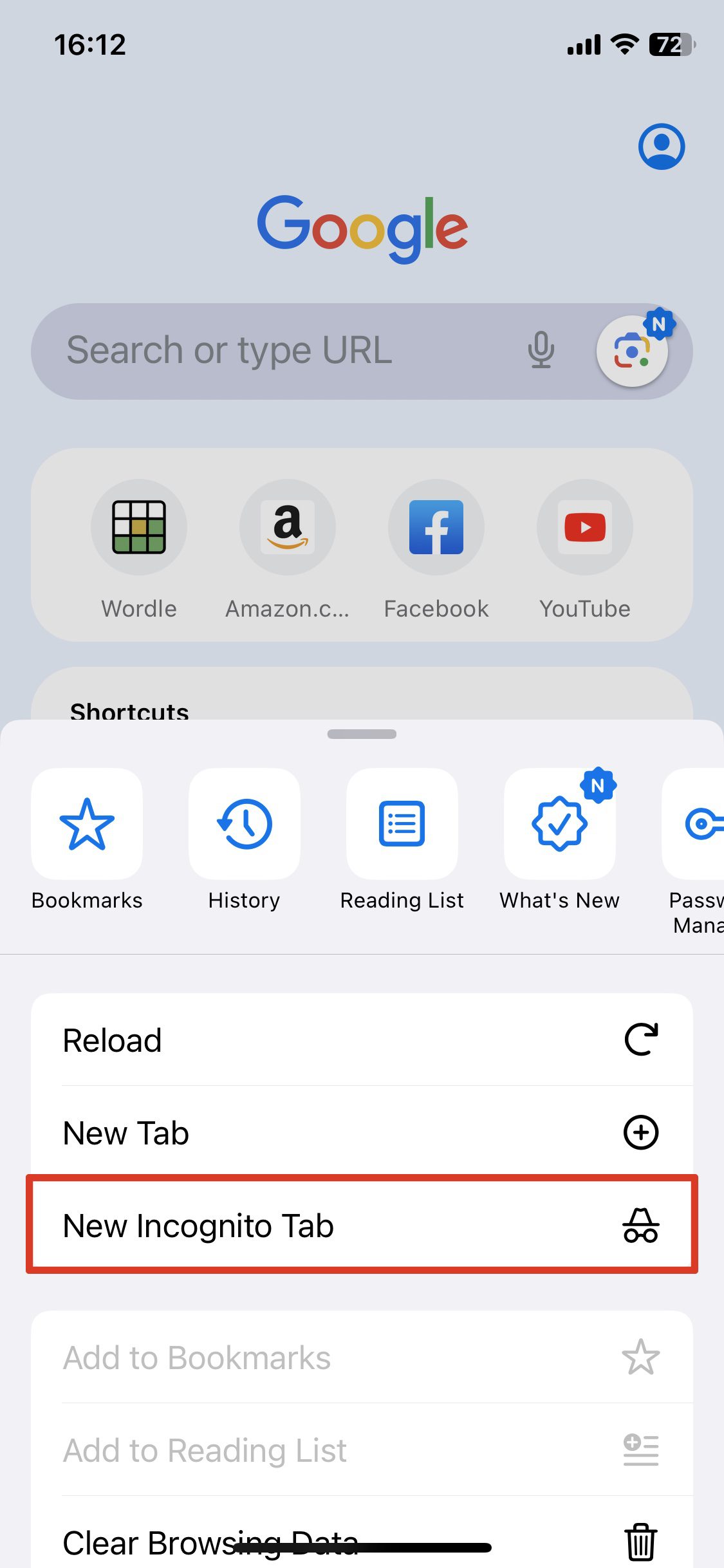- Tippen Sie auf Neuer Inkognito-Tab.