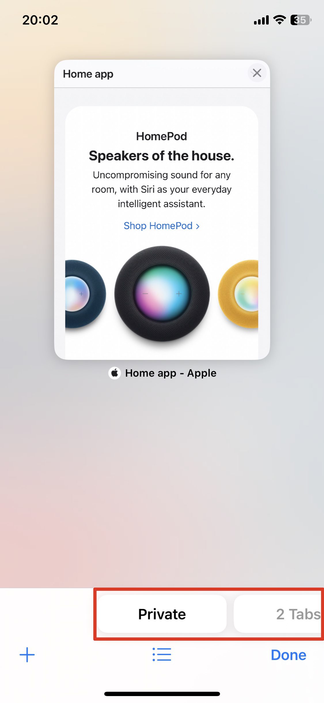 - Nun sollten Sie eine Übersicht Ihrer offenen Tabs sehen. Am unteren Rand des Bildschirms sehen Sie einen Button, der die Anzahl der geöffneten Tabs anzeigt. Swipen Sie diesen Button nach rechts oder tippen Sie auf den ausgegrauten Privat-Button.