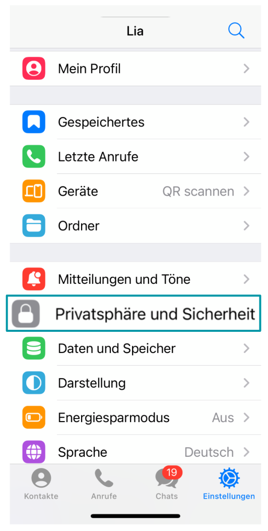 2. Tippen Sie auf Datenschutz und Sicherheit. Hier können Sie bestimmen, wer Ihre Telefonnummer, das Foto Ihres Profils sowie den Status Zuletzt gesehen sehen kann. Schränken Sie den Zugriff auf Meine Kontakte statt auf Alle ein, können Sie Ihre privaten Daten besser schützen.