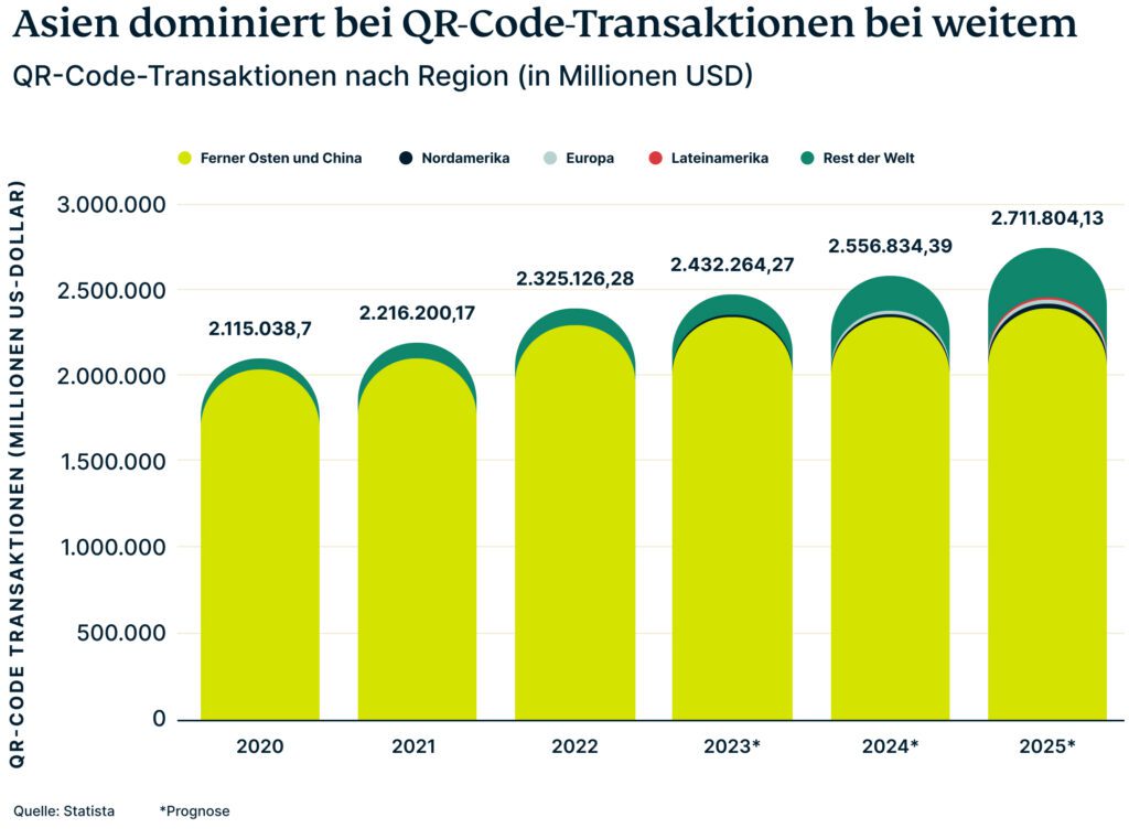 Laut Statista wird davon ausgegangen, dass die Region allein im Jahr 2023 Transaktionen über 2,2 Billionen USD über QR-Codes abwickeln wird. Es folgen Nordamerika, wo die Verbraucher QR-Codes für die Bezahlung von Waren und Dienstleistungen im Wert von 15,4 Milliarden USD nutzen werden, und Lateinamerika, wo QR-Codes den Schätzungen gemäß für Transaktionen in Höhe von 3,4 Milliarden USD verwendet werden.