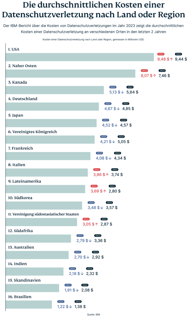 In Amerika scheint die Situation besonders schlimm zu sein. Die USA verzeichneten im Jahr 2023 mit 9,5 Millionen USD die höchsten durchschnittlichen Kosten für Datenschutzverletzungen.