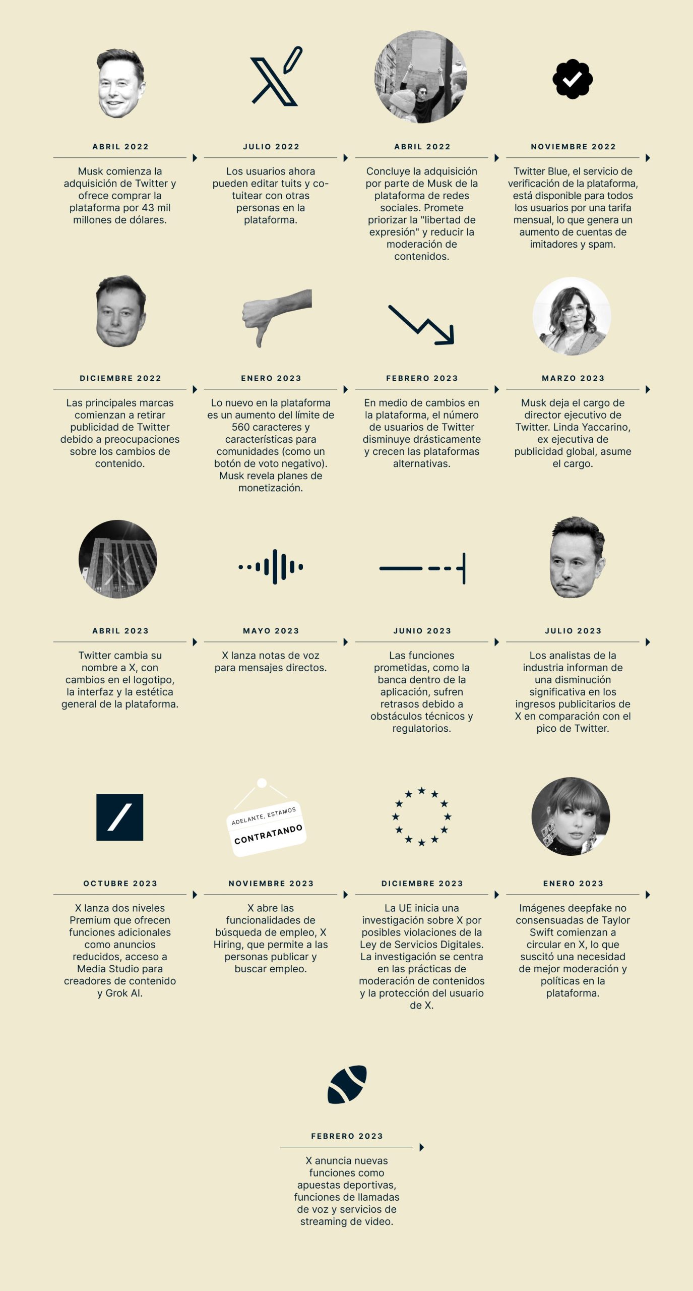 Antes de profundizar más, he aquí un breve resumen de los eventos clave y los cambios más importantes en X desde su adquisición por parte de Musk. Esta línea de tiempo destaca los cambios y anuncios públicos más importantes.
