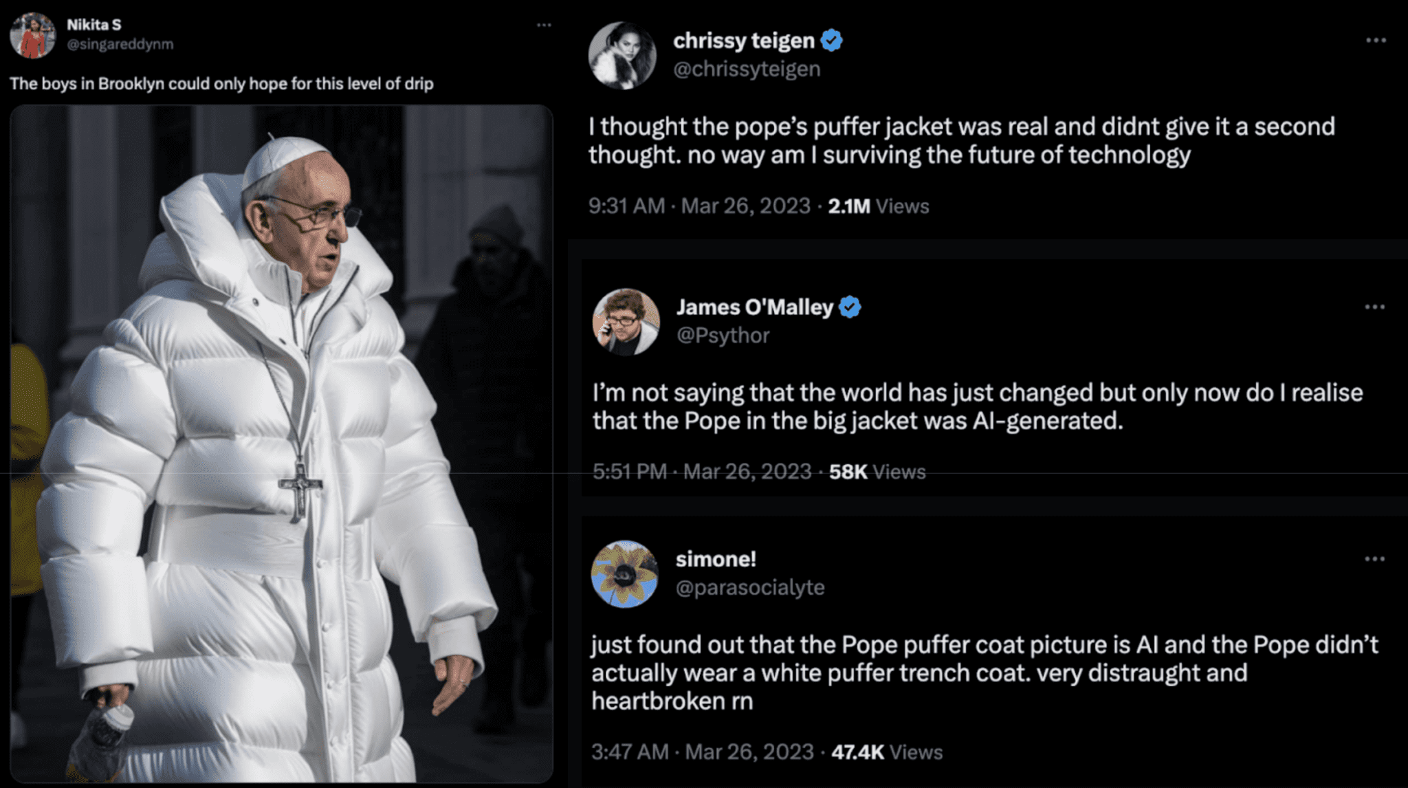 La tecnología ha avanzado hasta el punto de que estos deepfakes pueden ser casi indistinguibles del contenido real sin un análisis experto. Por ejemplo, ¿recuerda esas fotos deepfake generadas por IA del Papa Francisco con un gran abrigo blanco “de plumas” que engañaron a los usuarios online el año pasado?
