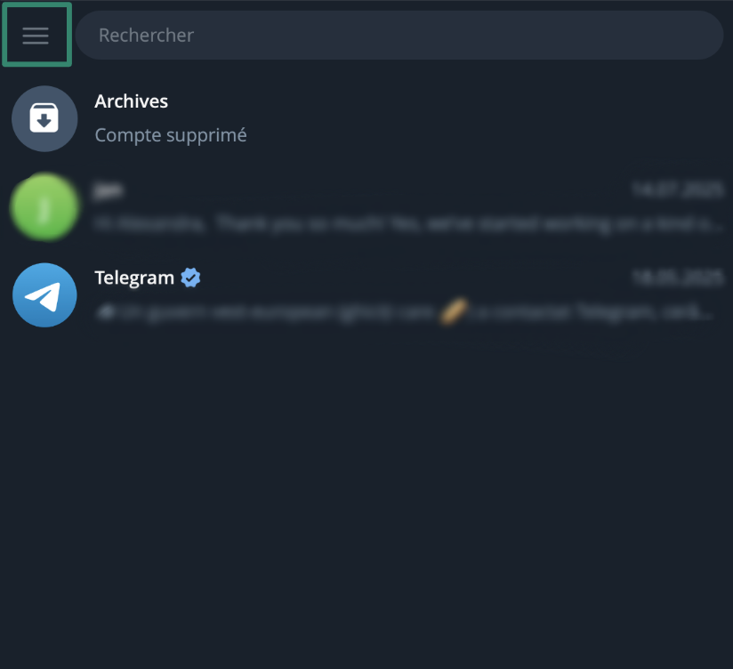 - Ouvrez l'application de bureau Telegram et cliquez sur l'icône hamburger dans le coin supérieur gauche.