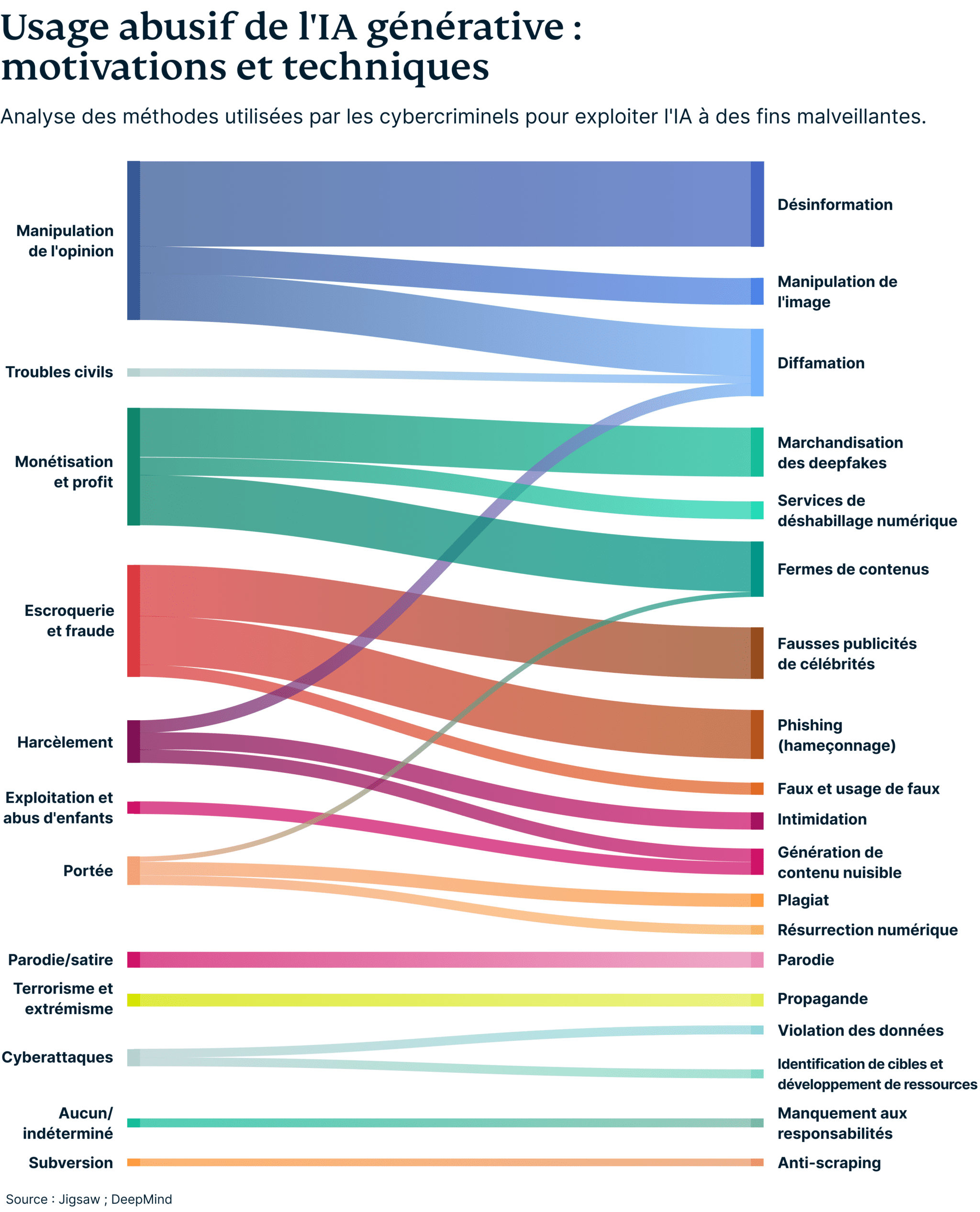 Une étude récente de Google DeepMind a révélé que la manipulation de l'opinion publique est la finalité malveillante la plus courante dans l'utilisation de l'IA générative, elle est véhiculée principalement par des médias trompeurs. La création de faux sons, images et vidéos de personnes est presque deux fois plus fréquente que l'utilisation abusive de l’IA générative pour la diffusion de publications numériques à des fins de désinformation.