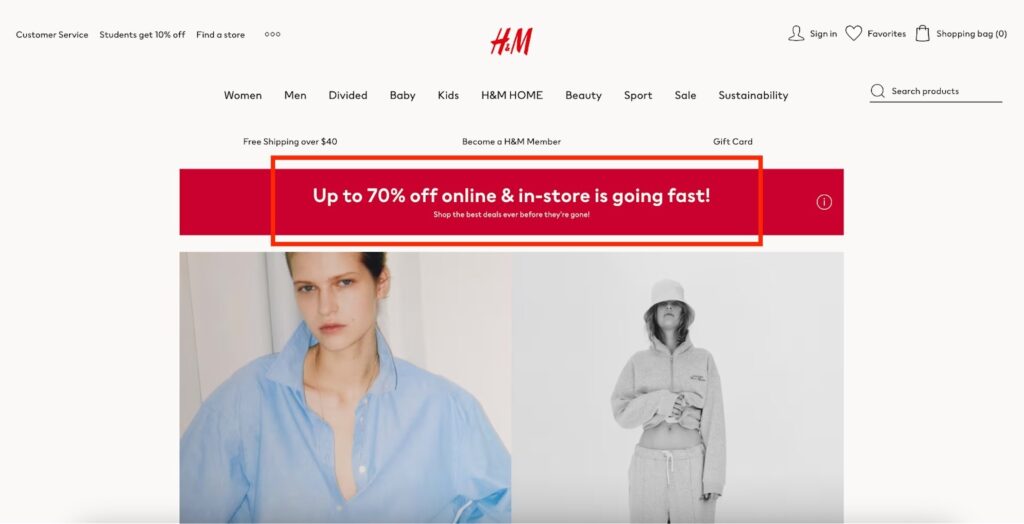 Il s'agit là de ventes limitées dans le temps qui créent un sentiment d'urgence et encouragent les clients à faire leurs achats au plus vite. Les sites de vente en ligne de prêt-à-porter comme ASOS, Shein et H&M se spécialisent dans les ventes flash, en proposant des offres de produits et de services pour une durée limitée.