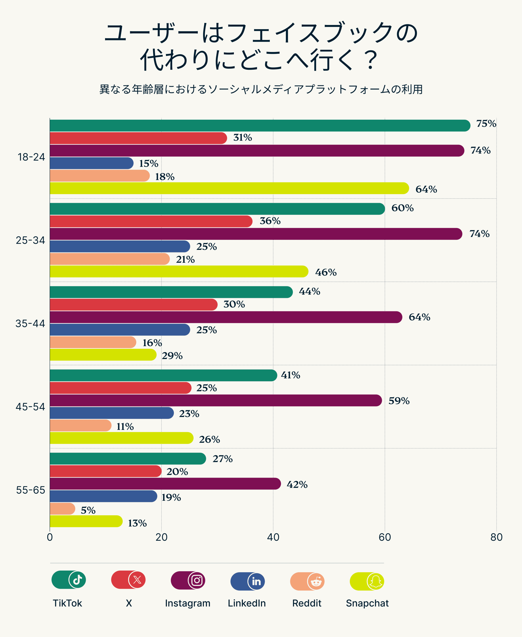 年齢層 | 友人や家族の活動が減った | 他のプラットフォームへ移行(Instagram、TikTokなど) | 広告が多すぎる/不要なコンテンツが多い | 退屈で機能が限られている | ボットや荒らしが多い | プライバシーの懸念 | 誤情報が多い |