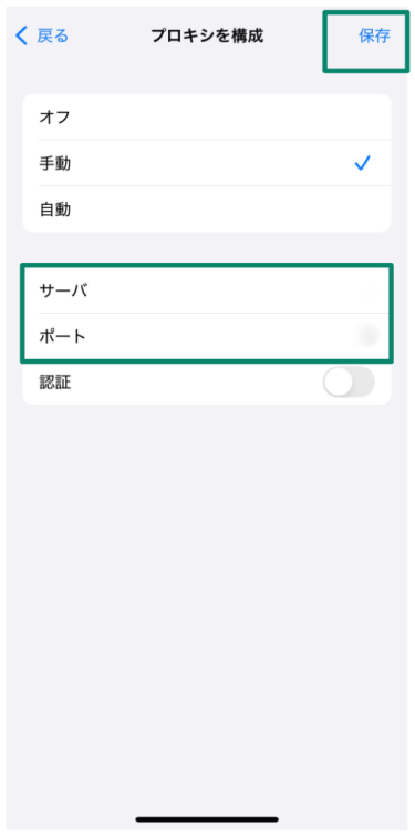 5. サービスに提供されたプロキシサーバーのアドレスポート番号を入力し、保存をタップします。