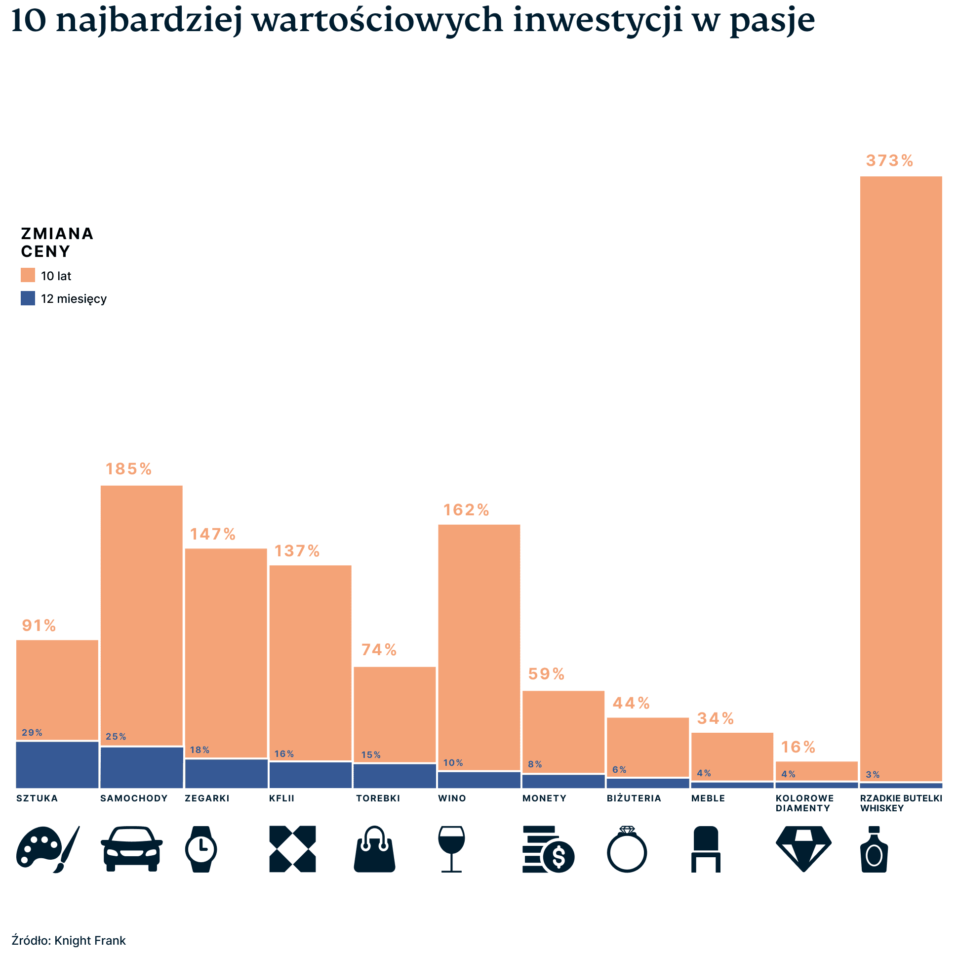 Jeśli chodzi o typy inwestycji w pasje, według raportu Knight Frank (KFLII) 2022 Wealth Report, rzadka whiskey jest zdecydowanym liderem, który może pochwalić się stopą wzrostu wynoszącą 373% w ciągu ostatnich 10 lat. Co ciekawe, przy określaniu wartości whiskey bierze się pod uwagę kilka czynników, w tym jej wiek, rzadkość i ogólną jakość.