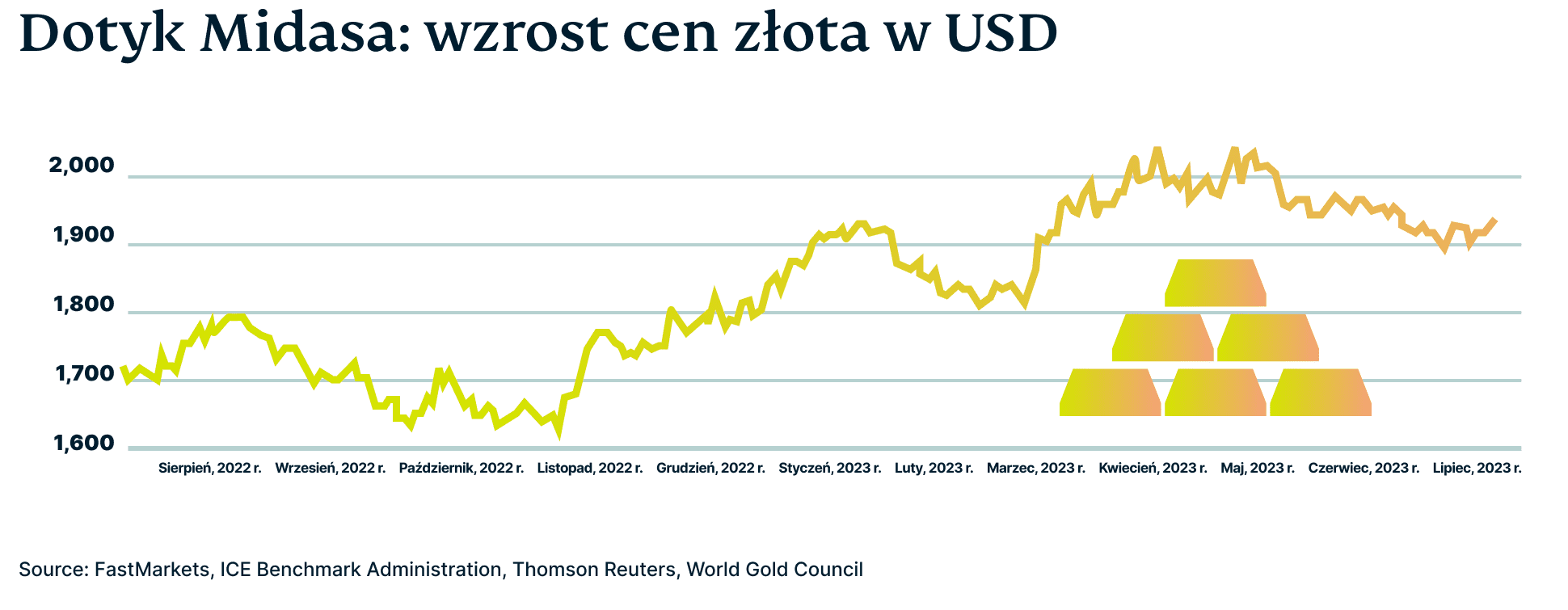 Jak donosi sprawozdanie finansowe Barron's (magazyn finansowy), cena złota przekroczyła 2000 USD za uncję w kwietniu tego roku, wyznaczając drugą najwyższą wartość w historii. W publikacji zauważono, że czynniki takie jak słabszy dolar amerykański, spadająca rentowność obligacji i potencjalne spowolnienie gospodarcze spowodowały wzrost zainteresowania złotem.