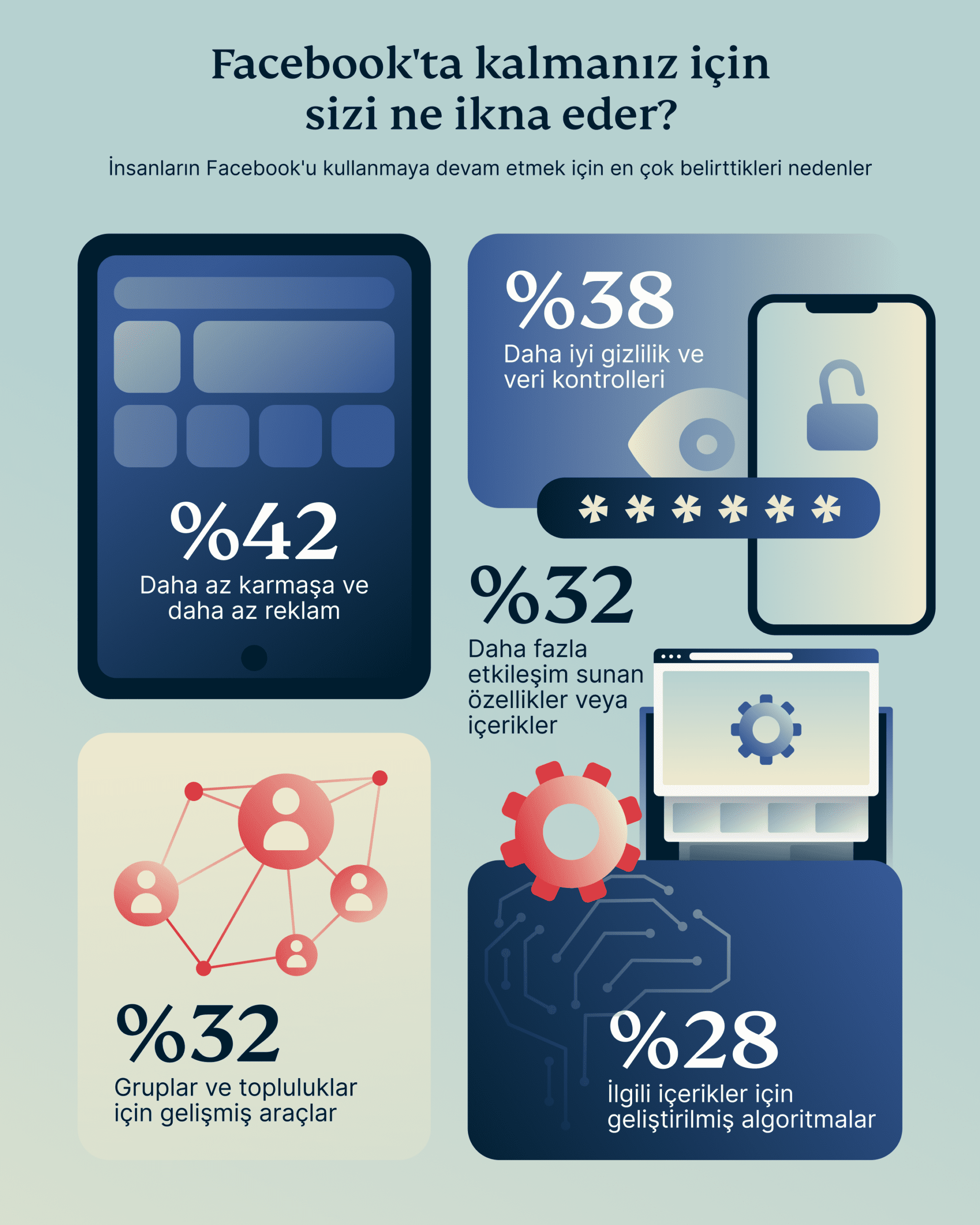 Facebook için iyi haber, değişimin imkansız olmaması. Kullanıcıların yaklaşık %35’i, platformun uyum sağlayarak değişen beklentilere cevap verebileceğine inanıyor. Geçmiş de gösteriyor ki Facebook, bağlantıları güçlendiren ve vazgeçilmez hissettiren araçlar sunduğunda başarılı oluyor.