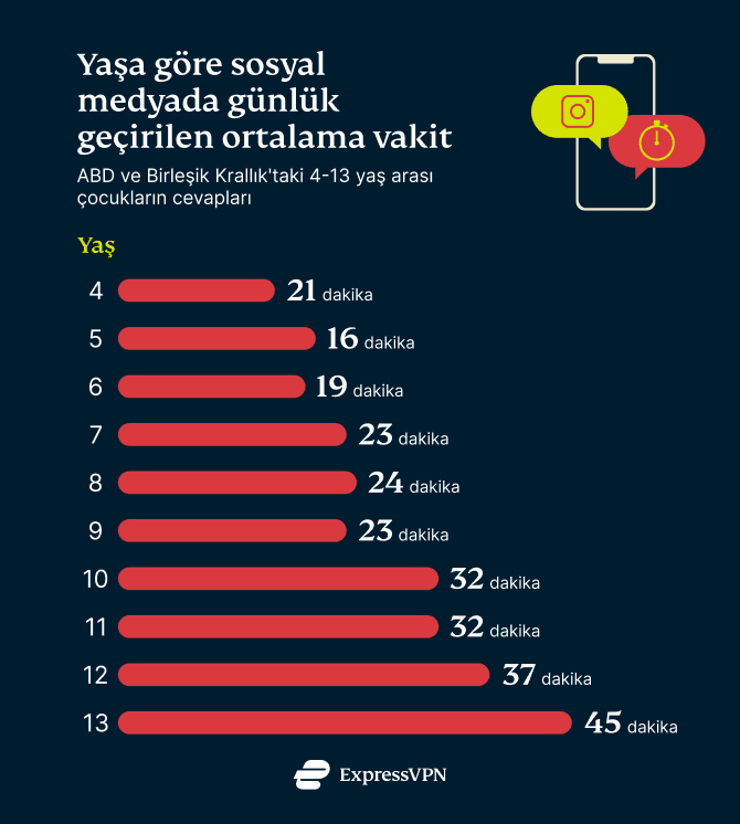 Beklendiği üzere, çocukların yaşı büyüdükçe sosyal medyada geçirdikleri süre de artıyor. 13 yaşındaki Amerikalı ve Britanyalı çocukların günlük ortalama 45 dakikaya sahip olması sürpriz değilken, sosyal medya platformlarına erişimi olan 4 yaşındaki çocuklar sosyal medyada her gün ortalama 21 dakika geçiriyor.
