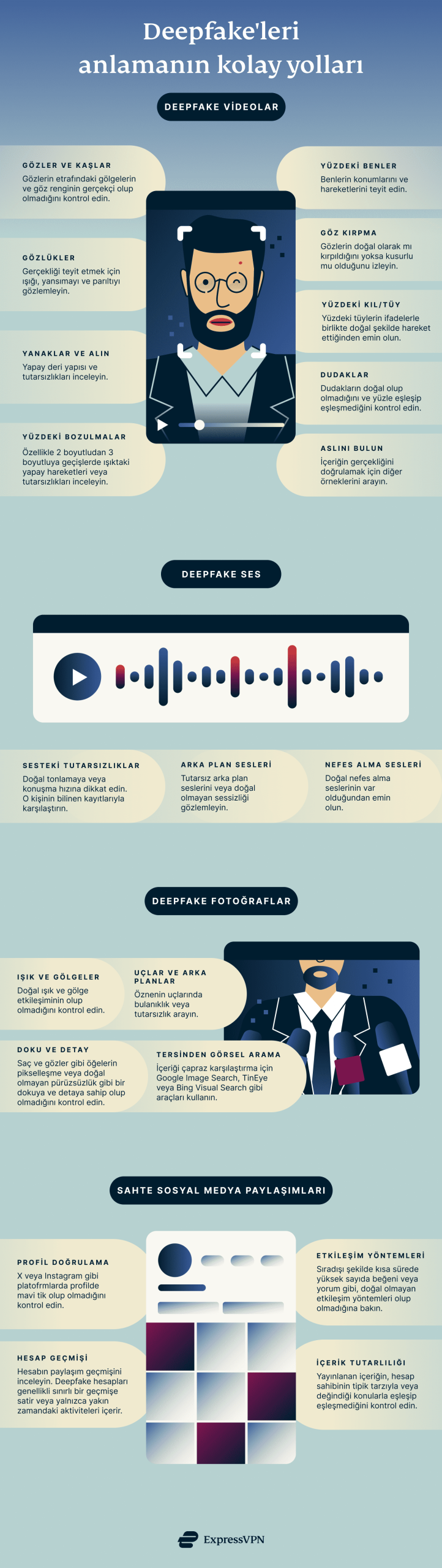 • Lider VPN hizmeti sağlayıcılarından biri olan ExpressVPN, kullanıcıların deepfake’in bariz göstergelerini ve sahte seçim haberlerini anlamalarına yardımcı olmak için bir kılavuz sunuyor.