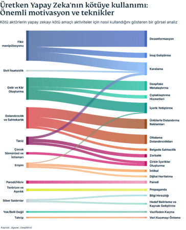 Yakın zamanda gerçekleştirilen bir Google DeepMind çalışması, başta deepfake medya olmak üzere, üretken Yapay Zeka’nın kullanımının en yaygın kötü amaçlı hedefinin kamuoyunu etkilemek olduğunu ortaya koydu..İnsanların gerçekçi ama sahte görüntü, video ve seslerinin oluşturulması, üretken YZ araçlarının bir sonraki en çok kötüye kullanıldığı alan olan metin tabanlı yanlış bilgi içeriği oluşturmanın neredeyse iki katıydı.