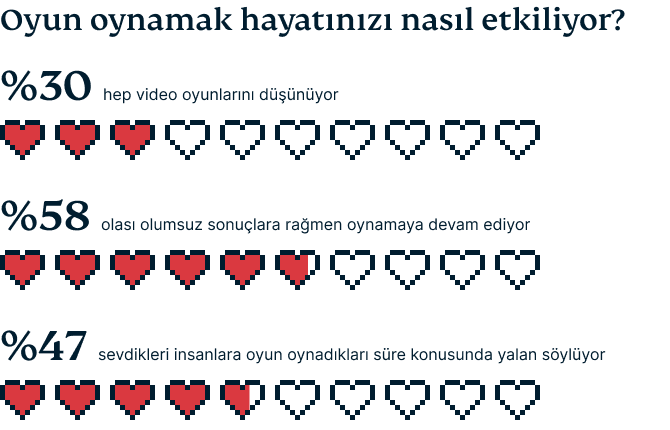 Sorulduğunda, katılımcıların beşte birinden fazlası oyun oynamak için daha az zaman harcamayı tercih ettiklerini belirtirken, Y Kuşağındakilerin %5’i ve Z Kuşağındakilerin %3’ü oyun bağımlısı gibi hissettiklerini söyledi.