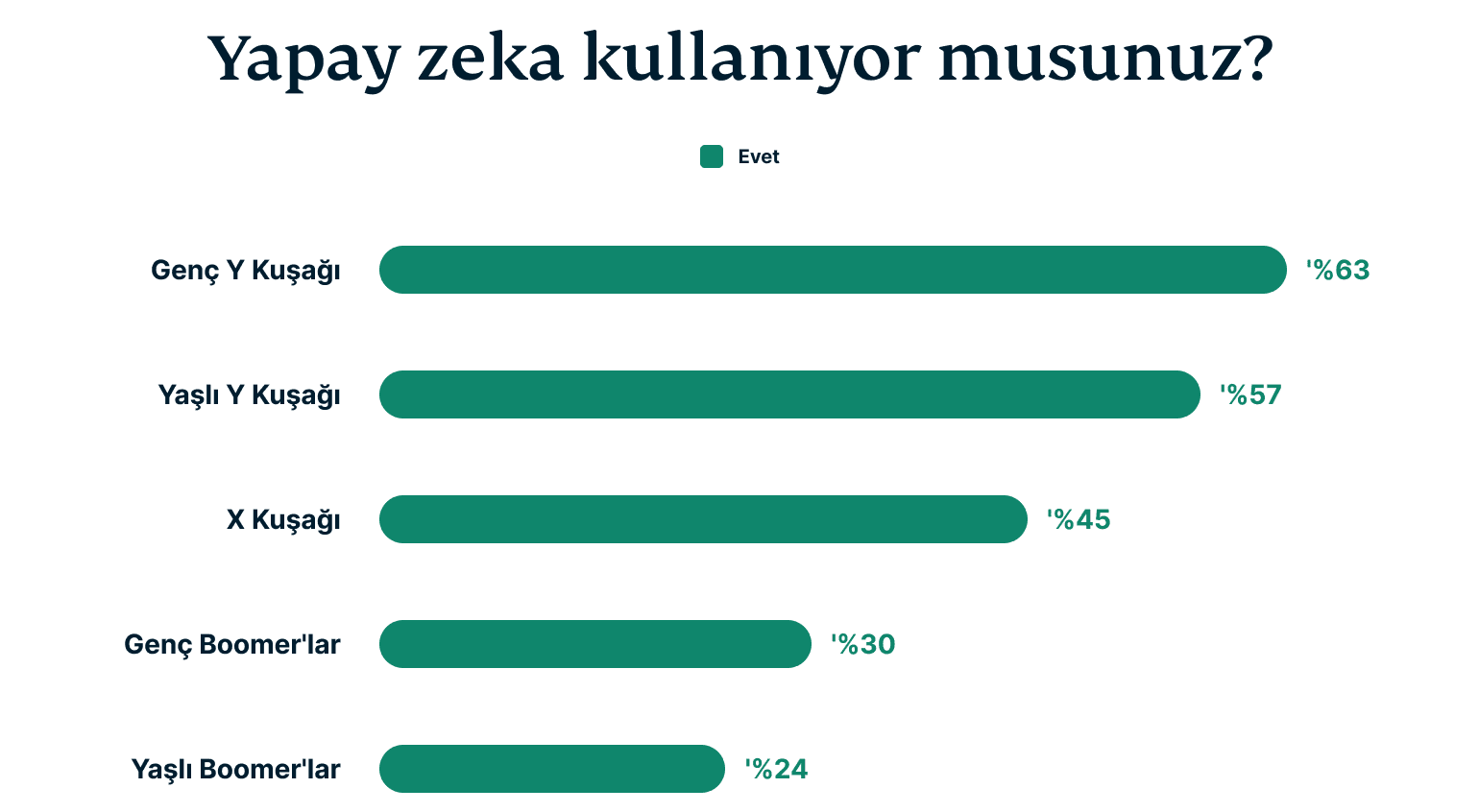 YZ araçlarını kullanma konusunda nesiller arasında belirgin bir ayrım var. Anketimiz, Genç Y kuşağının %63'ünün chatbotlar, akıllı asistanlar veya daha gelişmiş uygulamalar gibi YZ ile bir şekilde etkileşimde bulunduğunu gösteriyor. Ancak yaş grupları arasında ilerledikçe bu heves azalıyor. X kuşağının %45'i yapay zekayı ara sıra veya sürekli kullanırken, bu oran 69 yaş ve üstü bireylerde sadece %24'e düşüyor.