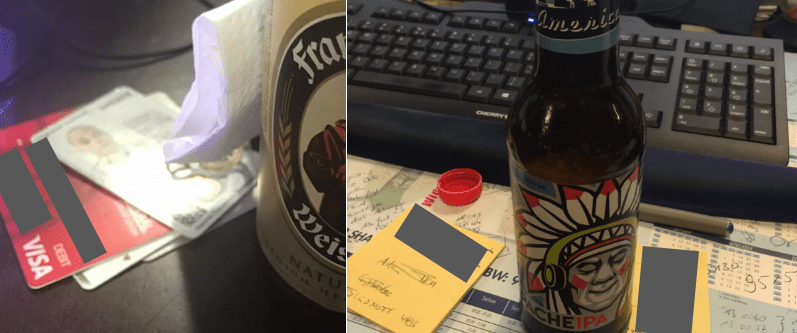 A picture of debit and ID card, and post-its at a desktop, posted on Untappd. (Source: Bellingcat)