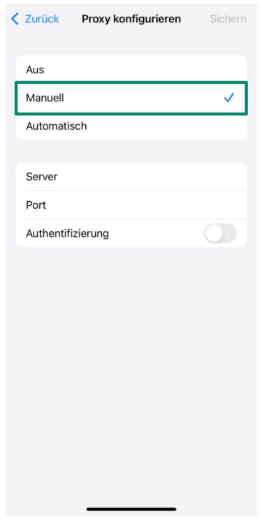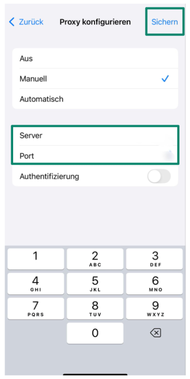 - Geben Sie die Proxy-Server-Adresse sowie die Port-Nummer an, die Sie von Ihrem Service erhalten haben. Tippen Sie anschließend auf Speichern.