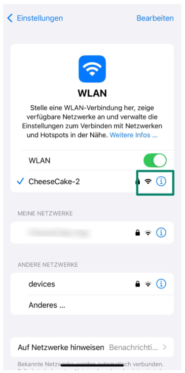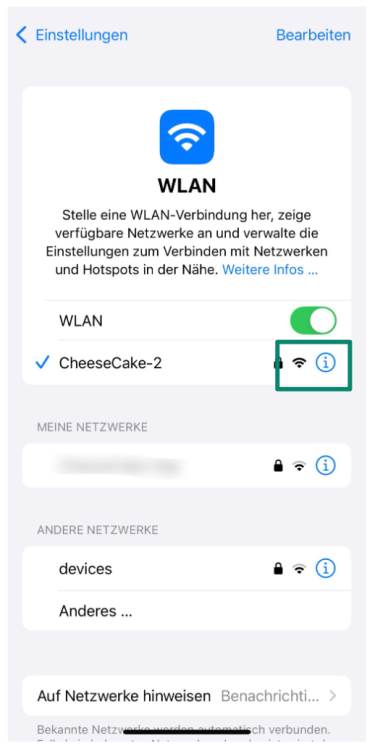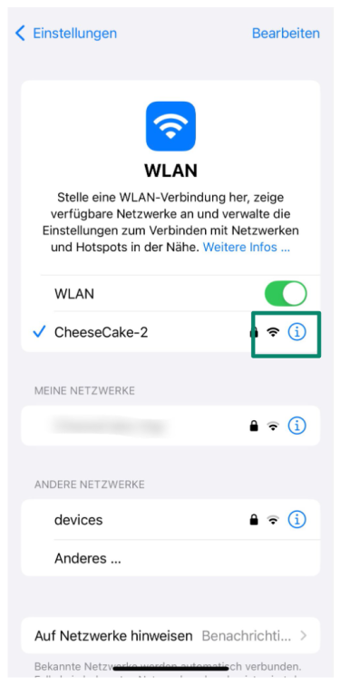- Finden Sie das Netzwerk, womit Sie verbunden sind und tippen dann auf das kleine Symbol (i) neben dem Namen Ihres Netzwerks.