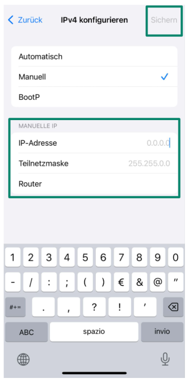 - Geben Sie die neue IP-Adresse, die Subnet-Maske sowie die Router-Adresse ein. Tippen Sie auf Speichern.