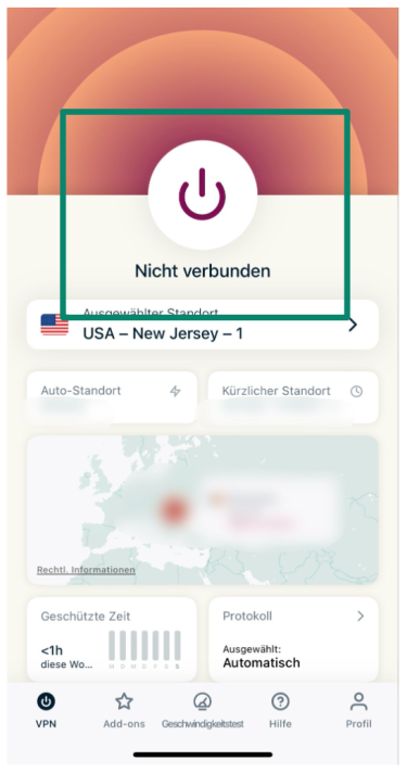 - Öffnen Sie die App und tippen auf den Einschaltknopf, um sich zu verbinden.
