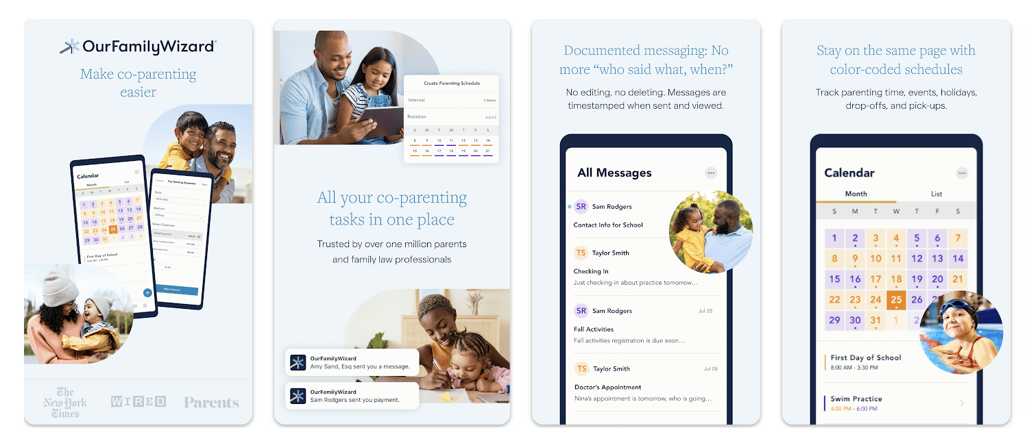 OurFamilyWizardは、両親がコミュニケーションを図り、子供中心の情報を一元的に共有できるように設計されており、共同親権の複雑さをナビゲートする共同親権者のためのプラットフォームとして機能します。両親は、子供の活動、カレンダー、共同親権のスケジュールをアップロードして管理し、支出を追跡し、医療や学校のファイルを共有し、プラットフォームを通じて安全なメッセージを直接送信できるため、対面でのコミュニケーションの必要がなくなります。