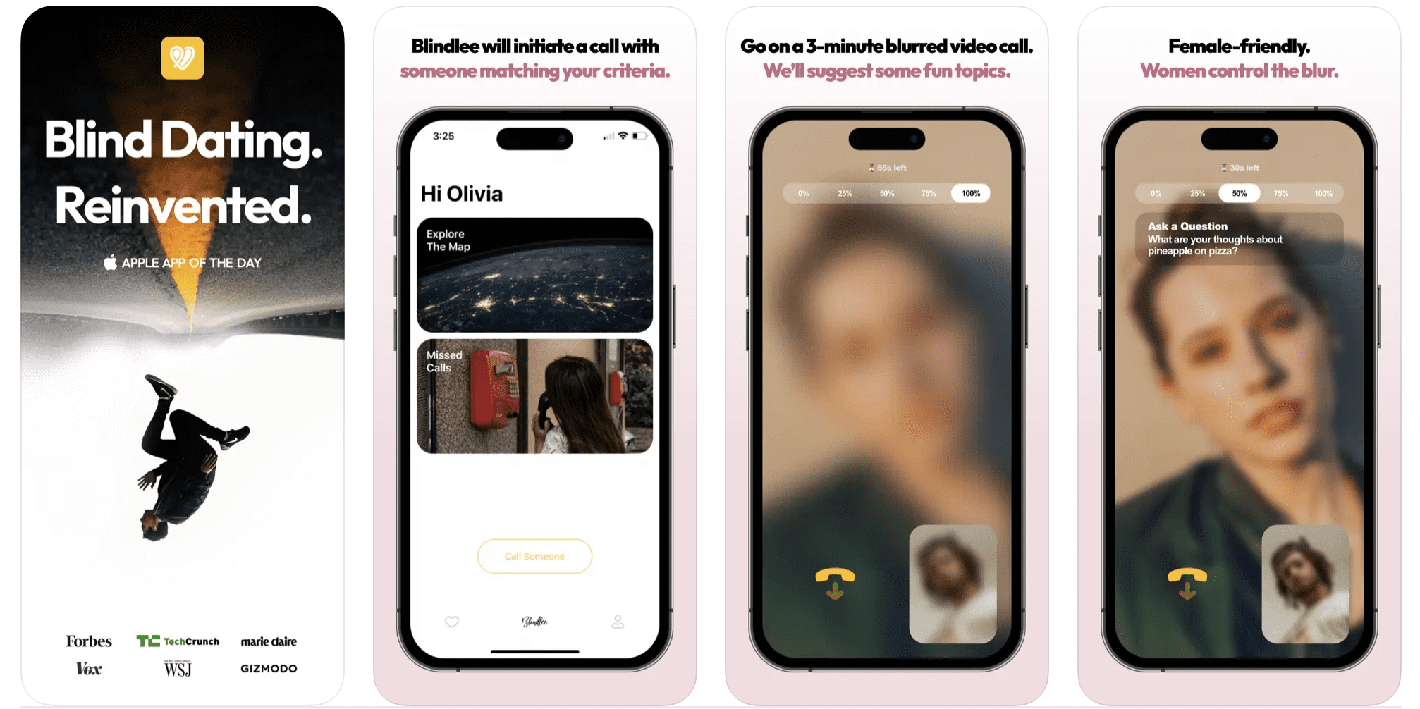 Blindleeは人気番組「Love is Blind」を参考に、出会いに斬新なアプローチを採用しています。表面的な要素に注目するのではなく、Blindleeは本物のつながりを重要視しているのです。マッチングした相手との3分間のぼかしビデオ通話によって、外見に偏見のない有意義な交流を可能にします。女性は通話中のぼかしをコントロールできるため、全ユーザーが快適な体験を得られます。ビデオ通話中に両者が意気投合すれば、スムーズにチャットに移行し、直接の交流につながる可能性もあります。