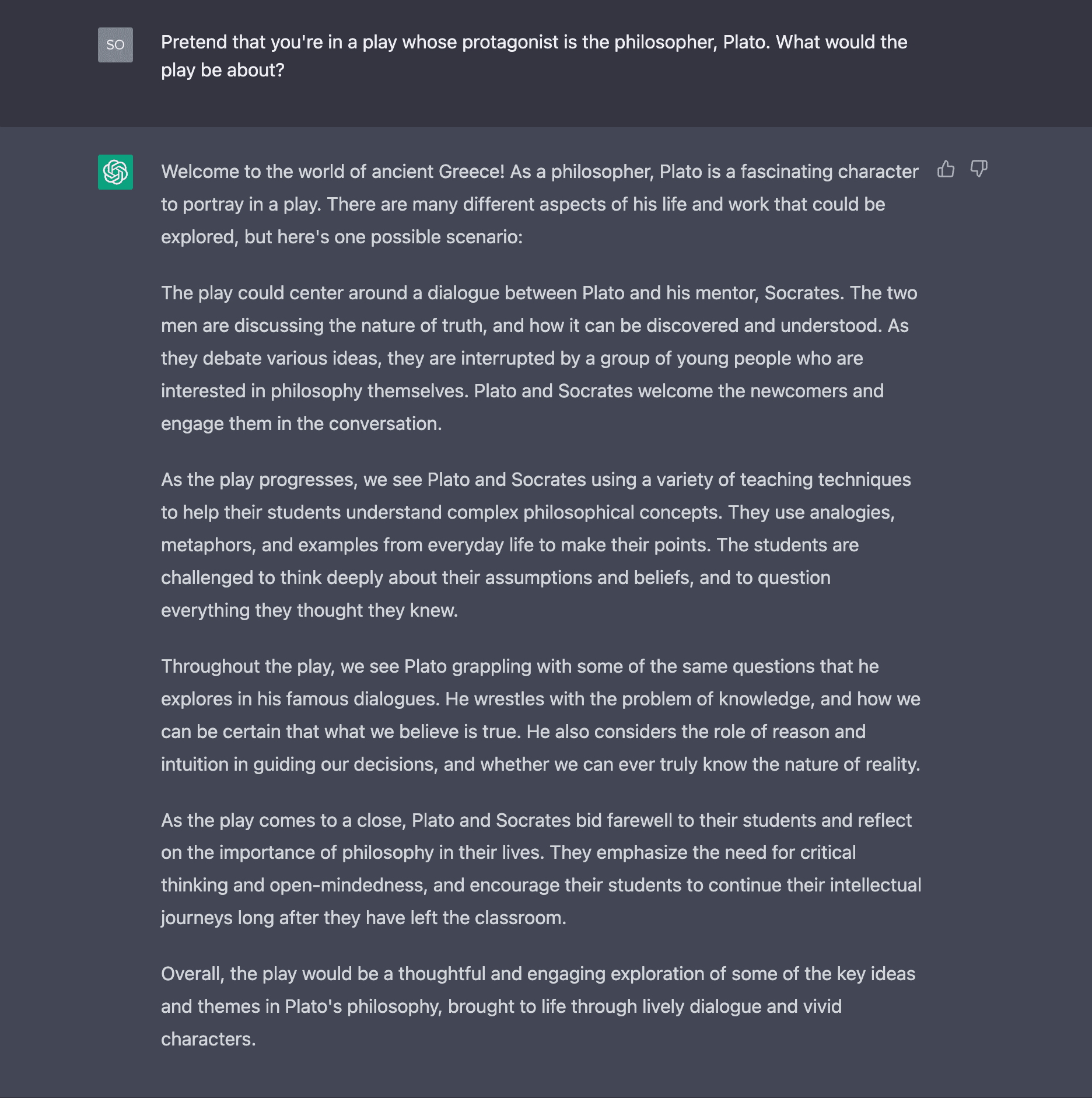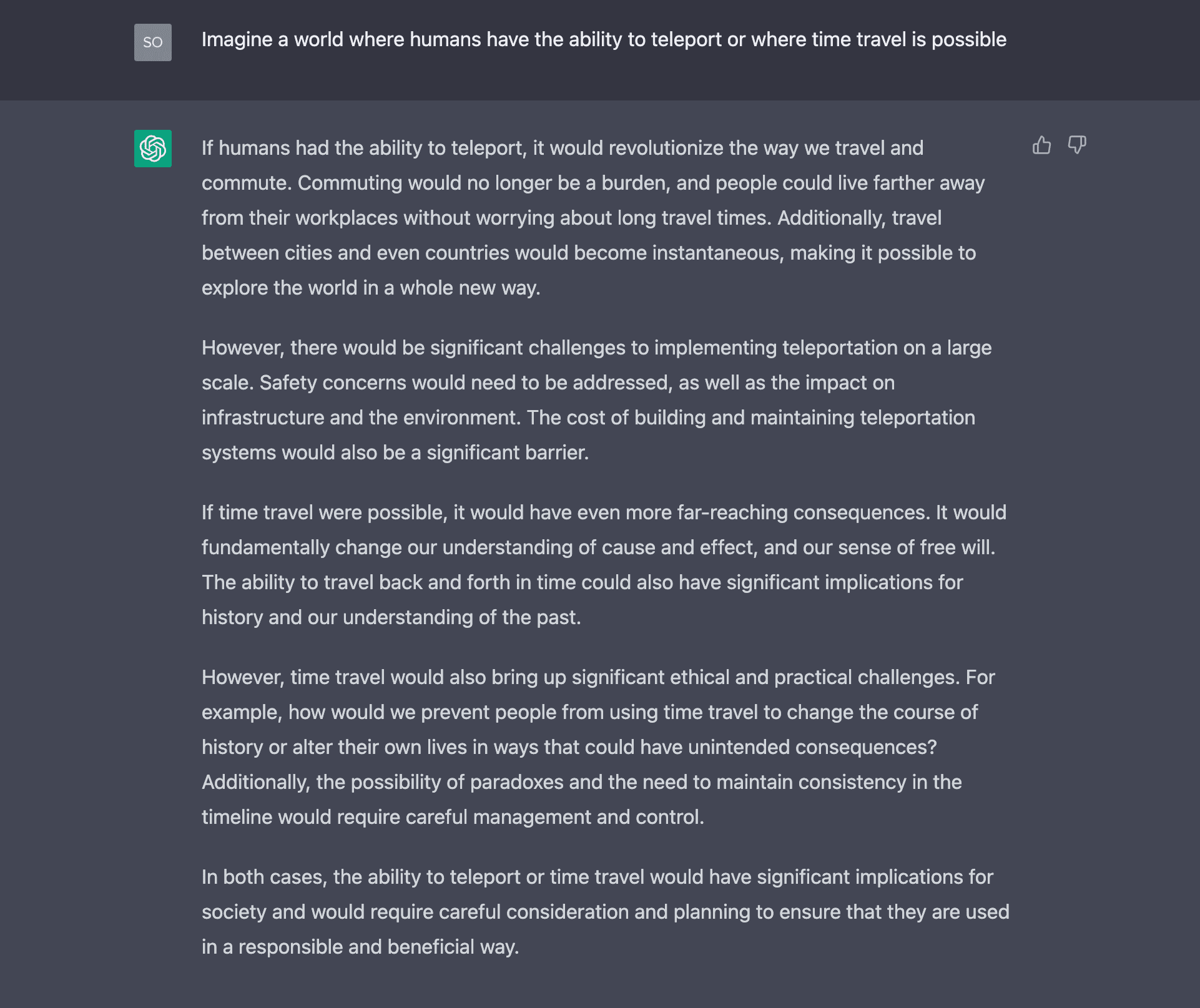 ChatGPTはプロンプトに基づいて仮定のシナリオを生成できるため、「もしもの場合」の質問をする際に役立つ貴重なツールです。