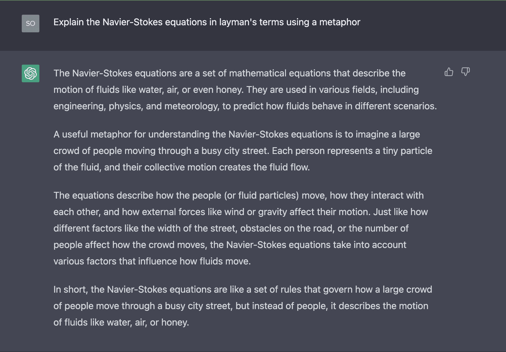 例え話や比喩は、新しいアイデアを生み出したり、難しくて複雑なトピックを理解したりするための強力な手段になります。また、目の前のテーマについて新鮮な視点を得るのにも役立ちます。例えば、複雑な数学的概念について書いているものの、それを理解するのに苦労している場合は、ChatGPTにより理解するのに役立つ比喩を提供してもらうことができます。