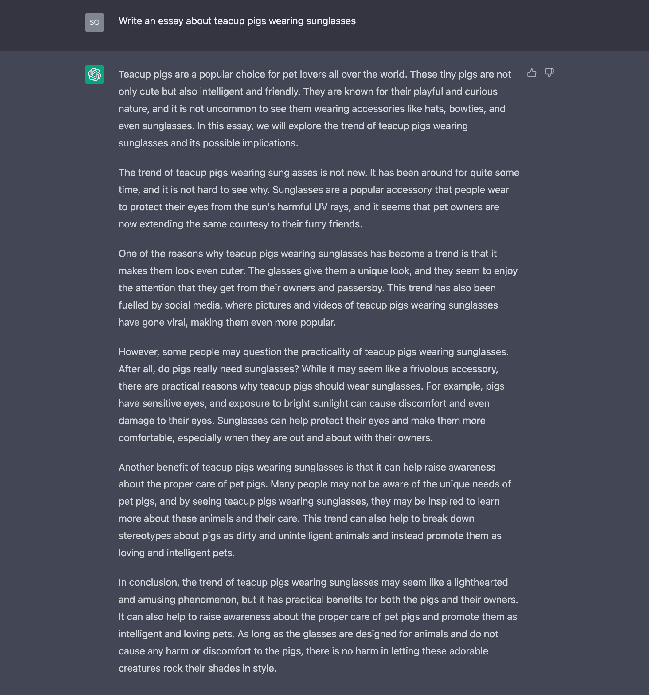 例えば、ChatGPTに「サングラスをかけたミニブタについてエッセイを書いて」と依頼すると、AIはその要求を満たすには程遠い、退屈で単純な文章を作成します。