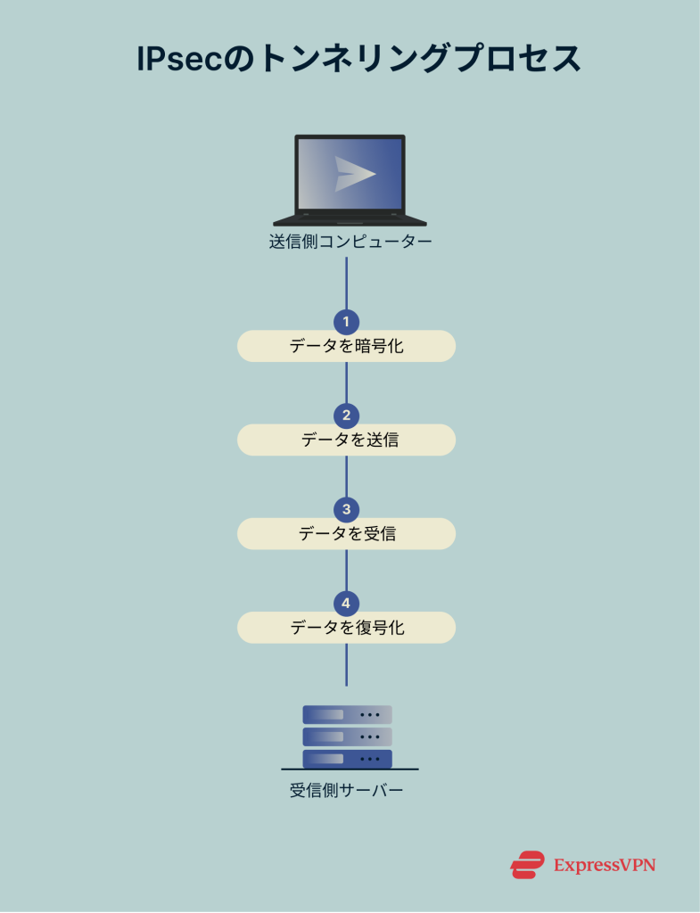 簡単に言えば、IPsecはデータがデバイスやネットワーク間を移動する際に安全な「トンネル」を作ります。データがインターネット上を移動する際には「IPパケット」と呼ばれる小さな単位に分割されます。IPsecはこれらのパケットを暗号化して第三者が内容を読めないようにし、また認証することで改ざんやなりすましを防ぎます。
