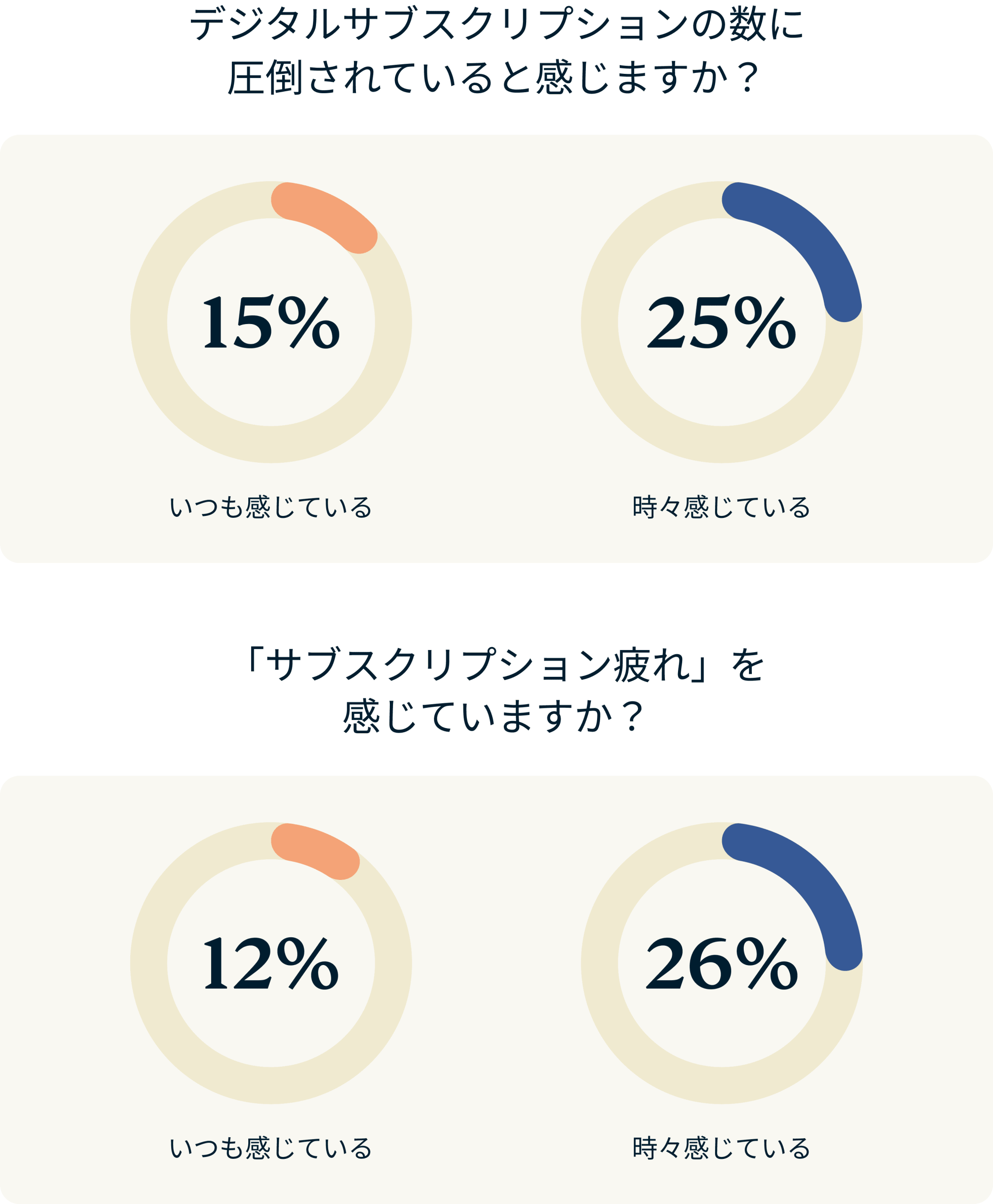 しかし、サブスクリプション疲れに寄与するのはコストやデバイスの問題だけではありません。多くのサービスを管理することに伴う精神的負担も大きな要因です。調査によると、回答者の40%が、管理するデジタルサブスクリプションの数に圧倒されていると答えました。