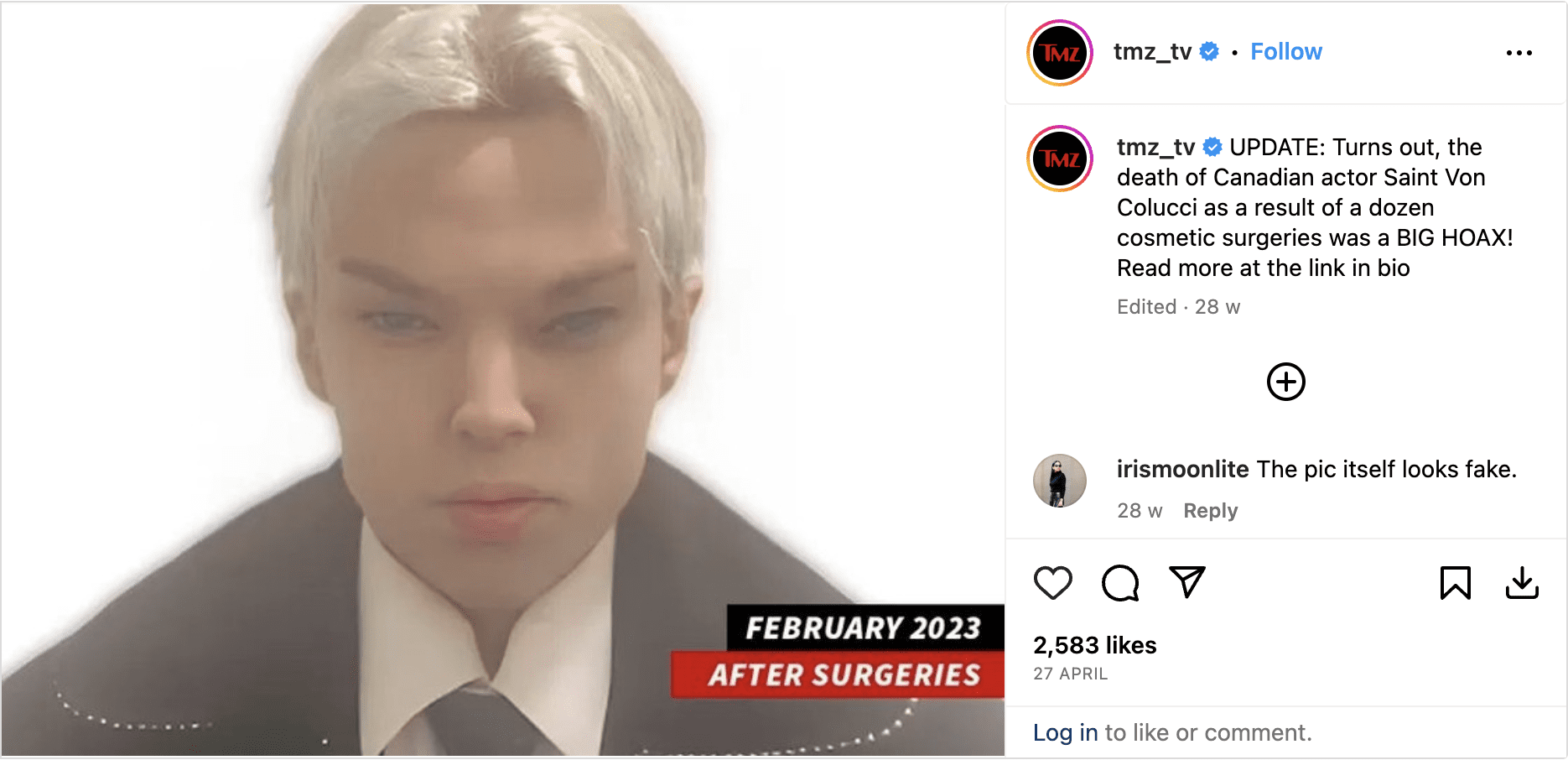 衝撃的な例として、BTSのジミンに似せるために何度も手術を受け、亡くなったとされる俳優兼歌手のセイント・フォン・コルッチの話があります。世界中のメディアは、彼が亡くなったとされること、20万ドルの手術を受けたこと、韓国ドラマに出演したことなどの報道で賑わいました。しかし、フォン・コルッチは実在しません。彼はAIが作成した偽物で、世界のメディアを騙すことに成功したという証拠が示されています。