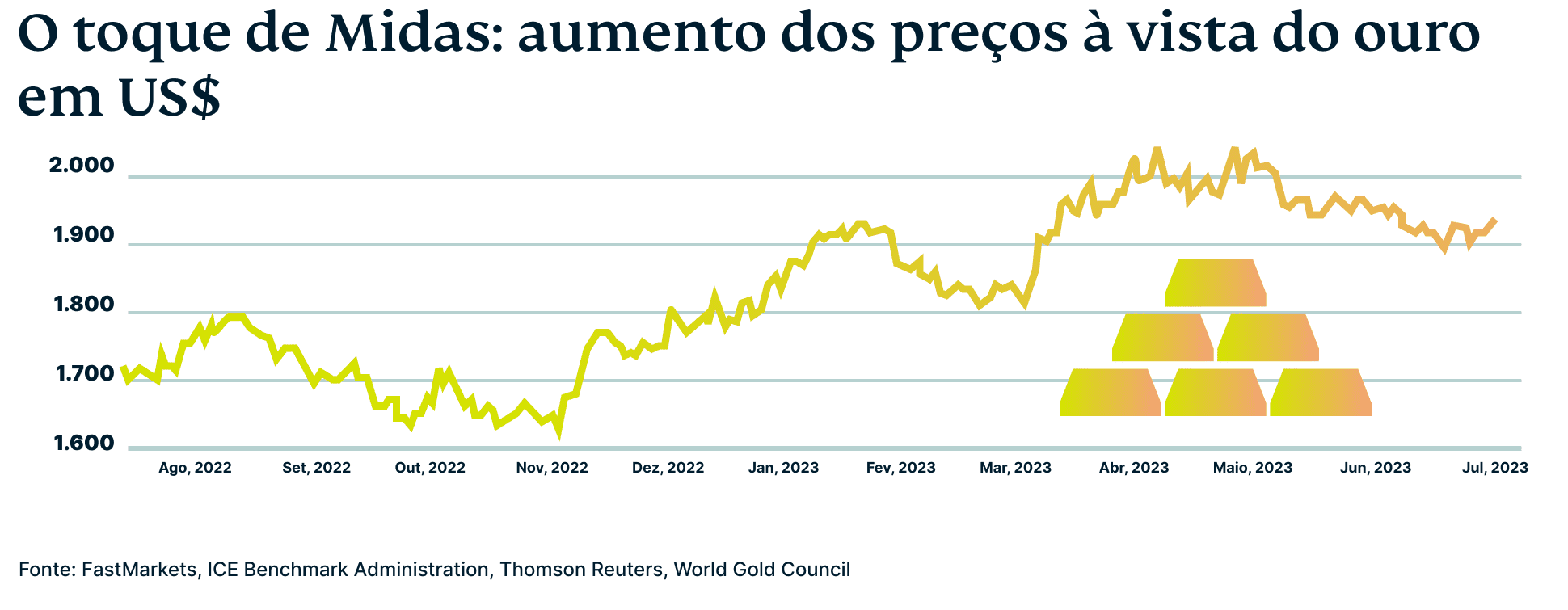 Conforme relatado pela Barron's, uma publicação financeira, o preço do ouro ultrapassou US$ 2.000 por onça em abril deste ano, marcando o segundo valor mais alto da história. A publicação financeira observou que fatores como um dólar americano mais fraco, rendimentos de títulos em declínio e o potencial de uma desaceleração econômica estimularam o aumento do interesse pelo ouro.