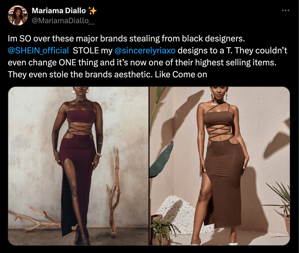 A Shein também foi acusada de copiar designs de artistas independentes e pequenos negócios. Diversos designers afirmaram publicamente que a Shein reproduziu suas criações originais em larga escala, sem permissão.
