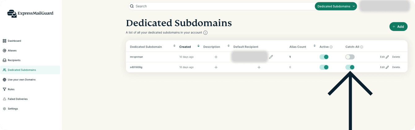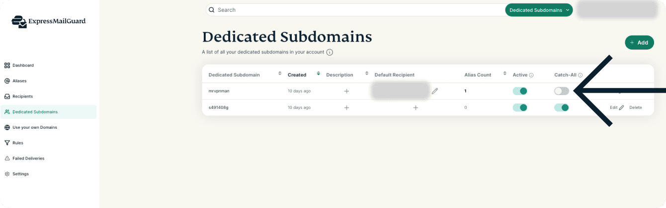 - Find the Dedicated Subdomain you want to enable Catch-All for and click the toggle button under the Catch-All column.