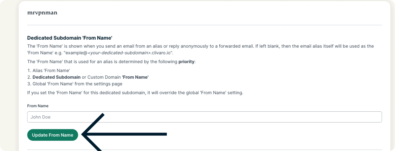 The ‘From Name’ is shown when you send an email from an alias or reply anonymously to a forwarded email. If left blank, then the email alias itself will be used as the ‘From Name’.