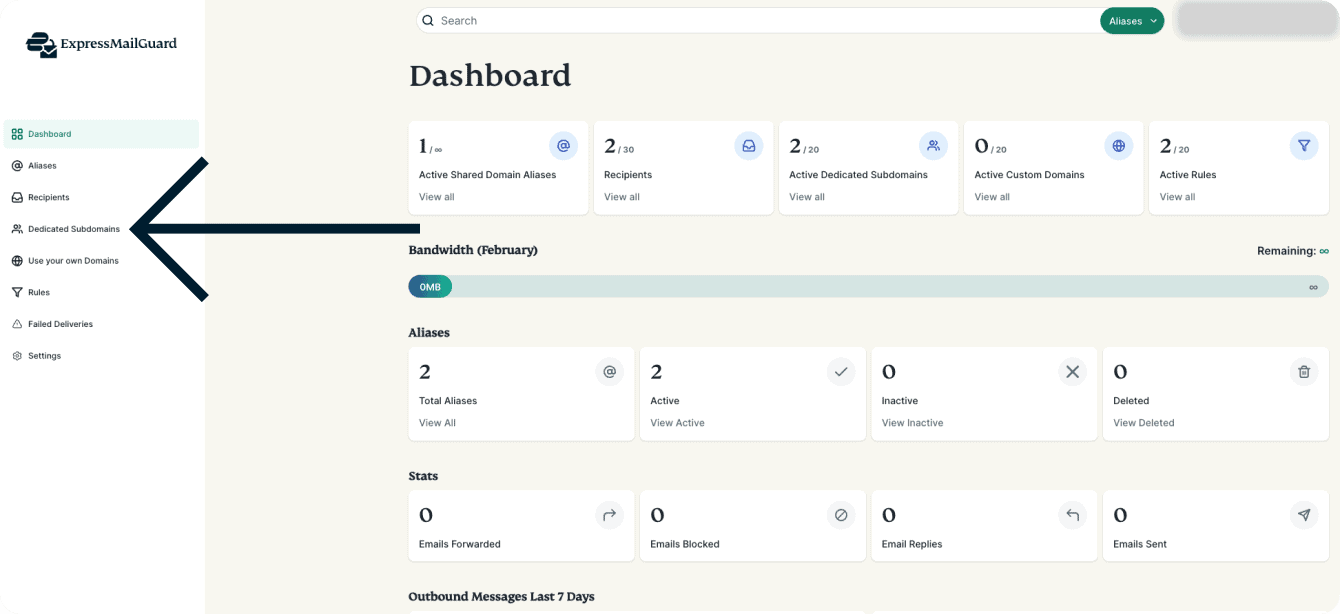 - On the ExpressMailGuard dashboard, click Dedicated Subdomains.