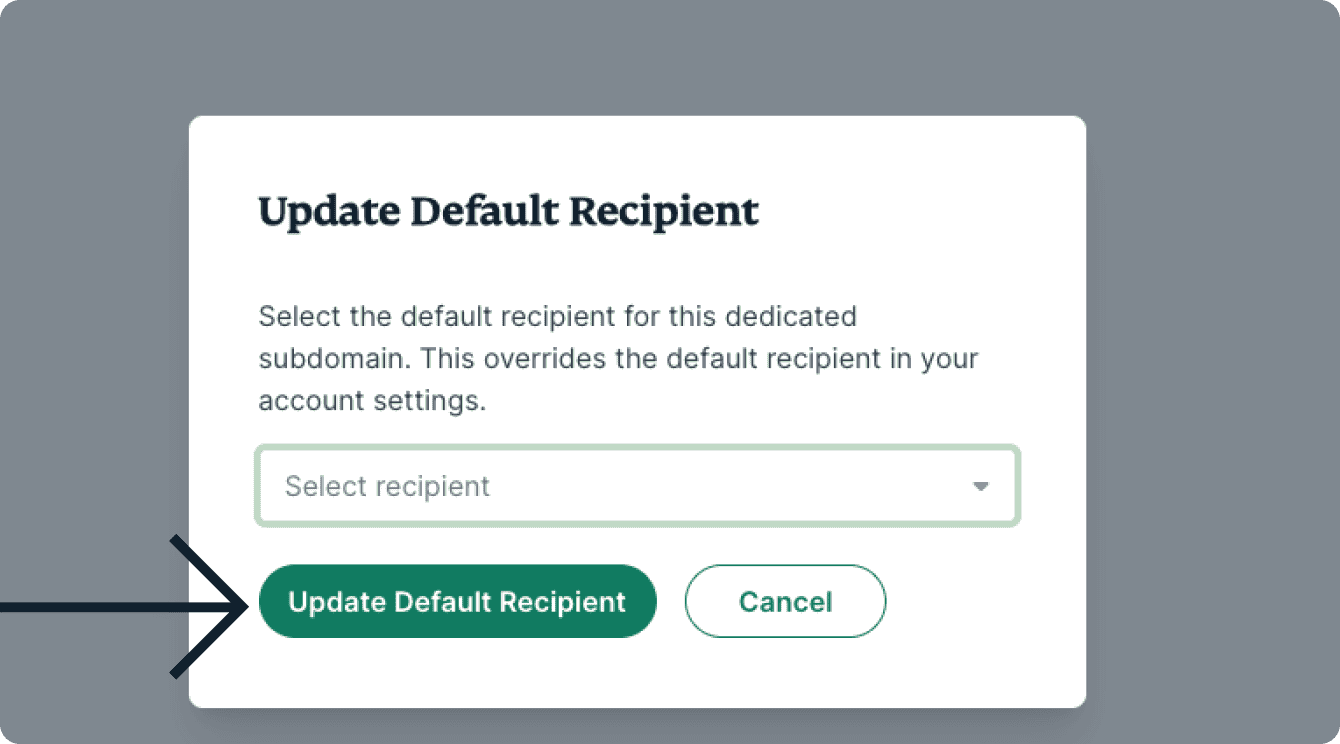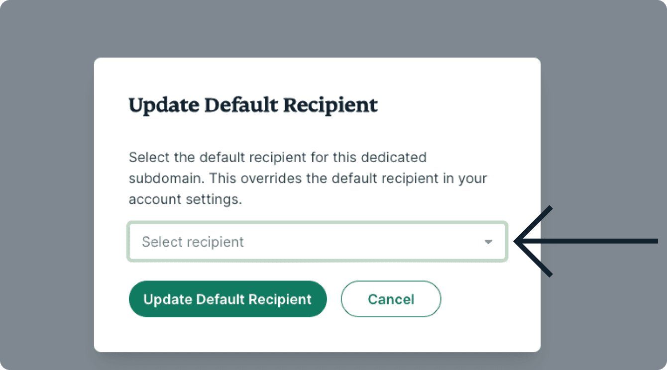 - Click the dropdown menu to choose your default recipient for that Dedicated Subdomain.